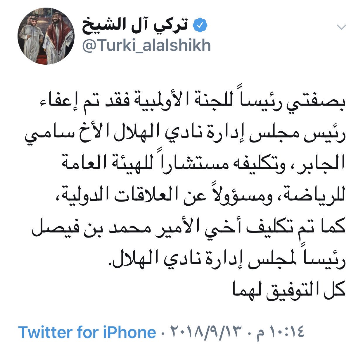 كتب سامي الجابر عبر حسابه بموقع التواصل الإجتماعي تويتر. وليصل لك كل جديدنا تابعنا بتويتر. ويأتي التغيير في رئاسة الهلال بعد أربعة أيام من.